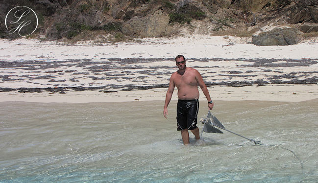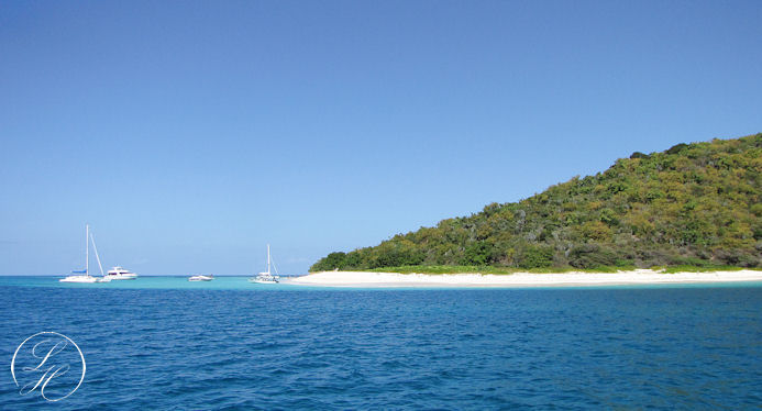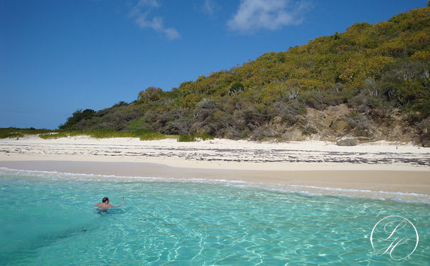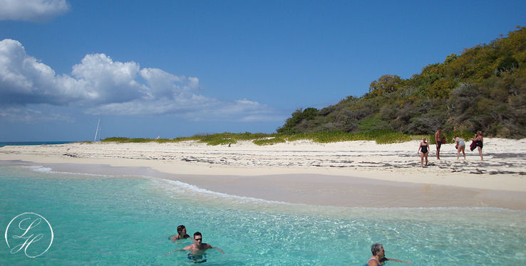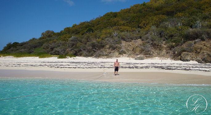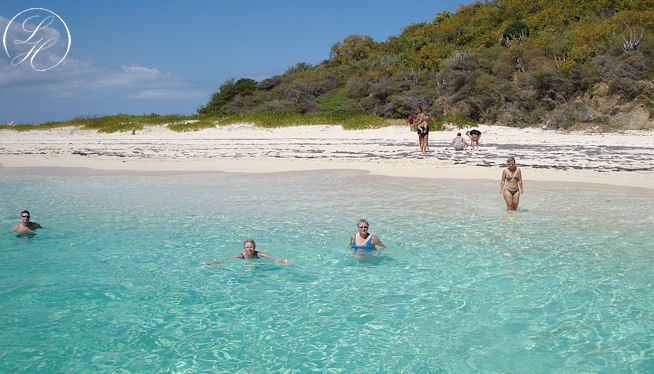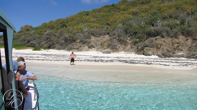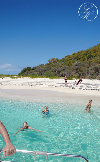 | Der var afsat en time til at snorkle (alt for kort tid) derefter sejlede vi ned langs øen, og lagde til. Vi kunne så gå i land lidt eller evt. tage en svømmetur. Vi gik i land, men lod vore kameraer blive ombord, idet vi skulle svømme/vade i land. Vi gik en tur langs vandet, det var simpelthen en herlig Bounty strand. Rundt om pynten kom vi ret tæt på nogle pelikaner, men kameraet var jo ikke med. |