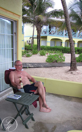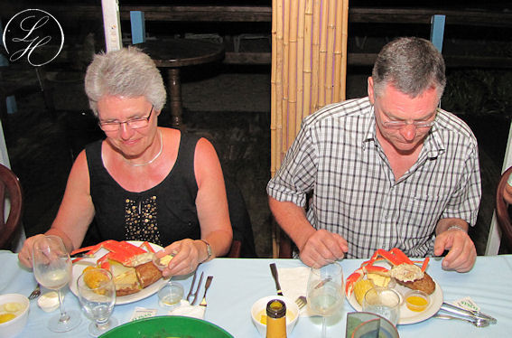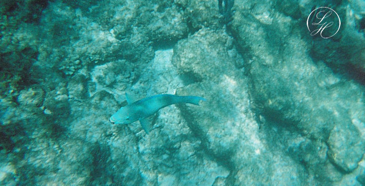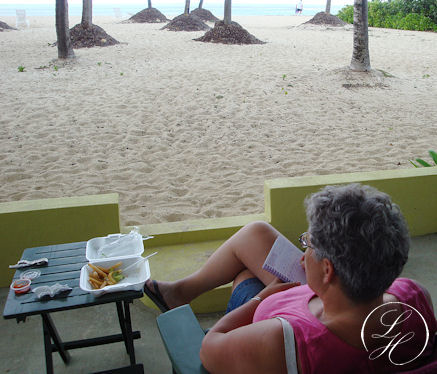 | Vi købte os en sandwich med pomfritter som vi spiste på terrassen - og så på regnvejr imens, det blev dog kun til en meget lille byge. Resten af eftermiddagen gik med afslapning og snorkling blandt farvestrålende fisk og små fisk i stimer. |