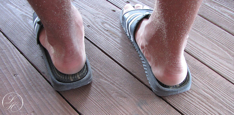 | Vi fik vores sko/sandaler og kørte tilbage til hotellet. Der opdagede Christian, at han havde to forskellige sandaler på, en str. 43 og en str. 45. |